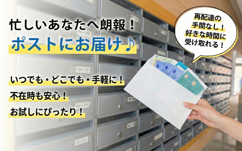 また、お試しセットは、後払いが可能かつ、「ネコポス(ポスト投函)」で届くので、お仕事で留守がちでも、すっぴんで家にいても、気兼ねなく受け取れます。