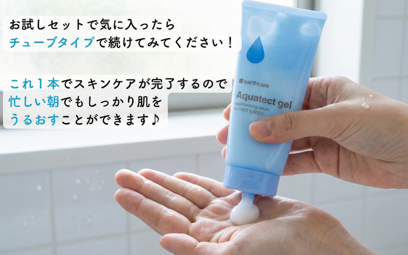 お試しセットで保湿力を実感し、肌に合うなと感じたら、チューブタイプでケアを続けてみてください。