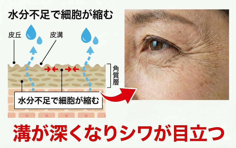乾燥が慢性化すると、角層の細胞が縮み、溝が深くなるためシワが目立つのは当たり前です。