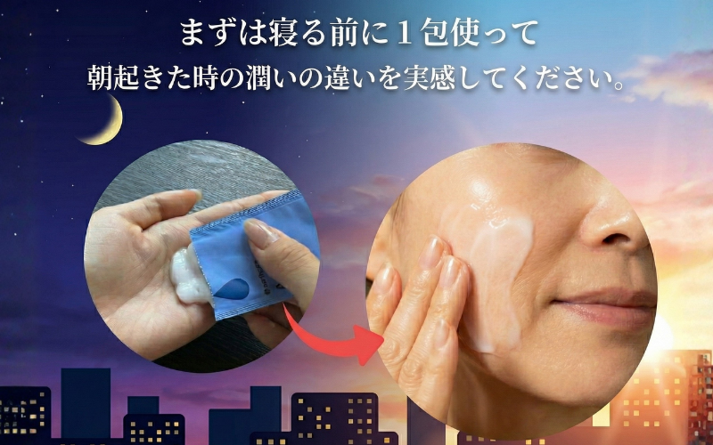 ただ、これまで化粧水や美容液を使ってきた方は、少し違和感があるかもしれません。なので、おすすめは夜のスキンケアで、1包をたっぷり塗ることです。