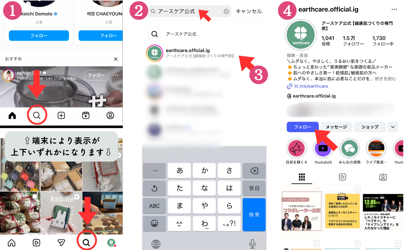 フォローすることで、インスタグラムを開いた時に表示されるホーム画面に、アースケアが発信したコンテンツを見れるようになります。